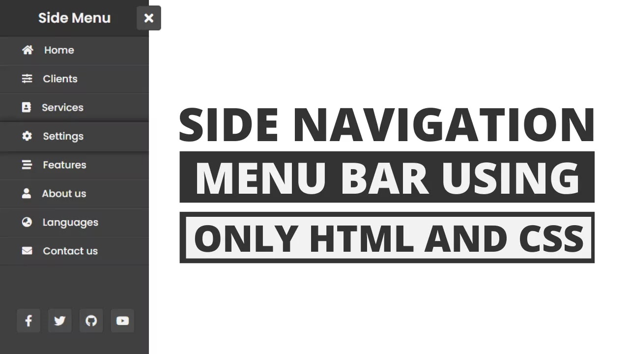 <!DOCTYPE html> <!-- Created By CodingLab - www.codinglabweb.com --> <html lang="en" dir="ltr"> <head> <meta charset="utf-8"> <title>Animated Sidebar Menu | CodingLab</title> <link rel="stylesheet" href="style.css"> <link rel="stylesheet" href="https://cdnjs.cloudflare.com/ajax/libs/font-awesome/6.1.2/css/all.min.css"> </head> <body> <div class="wrapper"> <input type="checkbox" id="btn" hidden> <label for="btn" class="menu-btn"> <i class="fas fa-bars"></i> <i class="fas fa-times"></i> </label> <nav id="sidebar"> <div class="title">Side Menu</div> <ul class="list-items"> <li><a href="#"><i class="fas fa-home"></i>Home</a></li> <li><a href="#"><i class="fas fa-sliders-h"></i>Clients</a></li> <li><a href="#"><i class="fas fa-address-book"></i>Services</a></li> <li><a href="#"><i class="fas fa-cog"></i>Settings</a></li> <li><a href="#"><i class="fas fa-stream"></i>Features</a></li> <li><a href="#"><i class="fas fa-user"></i>About us</a></li> <li><a href="#"><i class="fas fa-globe-asia"></i>Languages</a></li> <li><a href="#"><i class="fas fa-envelope"></i>Contact us</a></li> <div class="icons"> <a href="#"><i class="fab fa-facebook-f"></i></a> <a href="#"><i class="fab fa-twitter"></i></a> <a href="#"><i class="fab fa-github"></i></a> <a href="#"><i class="fab fa-youtube"></i></a> </div> </ul> </nav> </div> <div class="content"> <div class="header">Animated Side Navigation Menu</div> <p>using only HTML and CSS</p> </div> </body> </html>