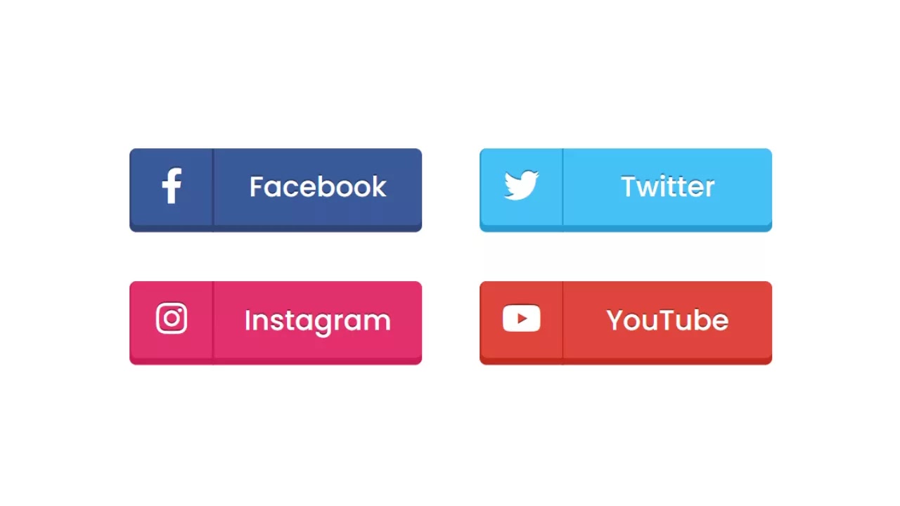 <!DOCTYPE html> <!-- Created By CodingNepal --> <html lang="en" dir="ltr"> <head> <meta charset="utf-8"> <title>3D Social Media Buttons | CodingNepal</title> <link rel="stylesheet" href="style.css"> <link rel="stylesheet" href="https://cdnjs.cloudflare.com/ajax/libs/font-awesome/5.15.3/css/all.min.css"/> </head> <body> <div class="buttons"> <div class="row"> <button class="facebook"> <span><i class="fab fa-facebook-f"></i></span> Facebook</button> <button class="instagram"> <span><i class="fab fa-instagram"></i></span> Instagram</button> </div> <div class="row"> <button class="twitter"> <span><i class="fab fa-twitter"></i></span> Twitter</button> <button class="youtube"> <span><i class="fab fa-youtube"></i></span> YouTube</button> </div> </div> </body> </html>
