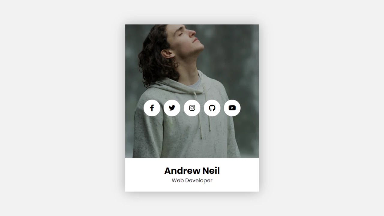 <!DOCTYPE html> <!-- Created By CodingNepal --> <head> <meta charset="utf-8"> <title>Animated Profile Card | CodingNepal</title> <link rel="stylesheet" href="style.css"> <link rel="stylesheet" href="https://cdnjs.cloudflare.com/ajax/libs/font-awesome/5.15.3/css/all.min.css"/> </head> <body> <div class="container"> <div class="image"> <img src="https://images.unsplash.com/photo-1492288991661-058aa541ff43?ixlib=rb-1.2.1&ixid=eyJhcHBfaWQiOjEyMDd9&auto=format&fit=crop&w=634&q=80"> </div> <div class="content"> <div class="info"> <h2> Andrew Neil </h2> <span>Web Developer</span> </div> </div> <ul> <li><a href="#"><span class="fab fa-facebook-f"></span></a></li> <li><a href="#"><span class="fab fa-twitter"></span></a></li> <li><a href="#"><span class="fab fa-instagram"></span></a></li> <li><a href="#"><span class="fab fa-github"></span></a></li> <li><a href="#"><span class="fab fa-youtube"></span></a></li> </ul> </div> </body> </html>