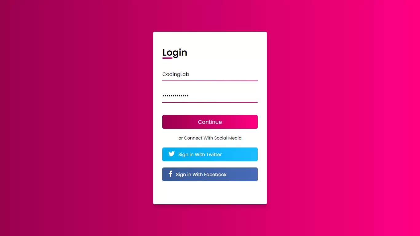 Have you guys notice that when I hover on the continue button, text width increase a little, and also its background gradient moves left to right. This type of animation is also seen on the social media button of Facebook and Twitter. By these two social media button user can enter the webpage by their Facebook or Twitter id.