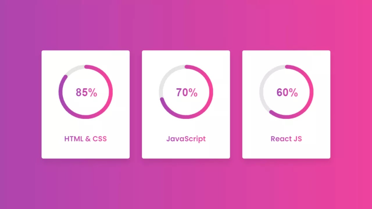 <!DOCTYPE html> <!-- Created By CodingNepal - www.codingnepalweb.com --> <html lang="en" dir="ltr"> <head> <meta charset="utf-8"> <title>Circular Progress Bar | CodingNepal</title> <link rel="stylesheet" href="style.css"> <meta name="viewport" content="width=device-width, initial-scale=1.0"> <script src="https://cdnjs.cloudflare.com/ajax/libs/jquery/3.5.1/jquery.min.js"></script> <script src="https://cdnjs.cloudflare.com/ajax/libs/jquery-circle-progress/1.2.2/circle-progress.min.js"></script> </head> <body> <div class="wrapper"> <div class="card"> <div class="circle"> <div class="bar"></div> <div class="box"><span></span></div> </div> <div class="text">HTML & CSS</div> </div> <div class="card js"> <div class="circle"> <div class="bar"></div> <div class="box"><span></span></div> </div> <div class="text">JavaScript</div> </div> <div class="card react"> <div class="circle"> <div class="bar"></div> <div class="box"><span></span></div> </div> <div class="text">React JS</div> </div> </div> <script> let options = { startAngle: -1.55, size: 150, value: 0.85, fill: {gradient: ['#a445b2', '#fa4299']} } $(".circle .bar").circleProgress(options).on('circle-animation-progress', function(event, progress, stepValue){ $(this).parent().find("span").text(String(stepValue.toFixed(2).substr(2)) + "%"); }); $(".js .bar").circleProgress({ value: 0.70 }); $(".react .bar").circleProgress({ value: 0.60 }); </script> </body> </html>