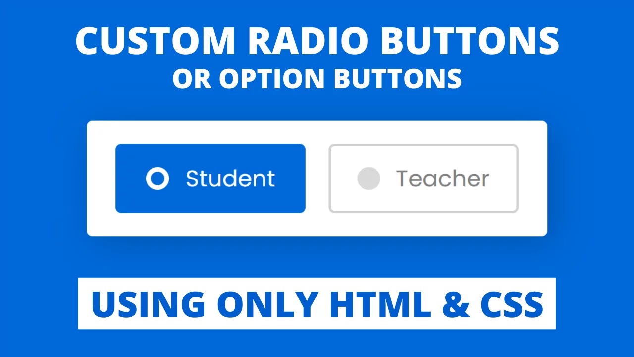 <!DOCTYPE html> <!-- Created By CodingNepal --> <html lang="en" dir="ltr"> <head> <meta charset="utf-8"> <title>Custom Radio Buttons | CodingLab</title> <link rel="stylesheet" href="style.css"> </head> <body> <div class="wrapper"> <input type="radio" name="select" id="option-1" checked> <input type="radio" name="select" id="option-2"> <label for="option-1" class="option option-1"> <div class="dot"></div> <span>Student</span> </label> <label for="option-2" class="option option-2"> <div class="dot"></div> <span>Teacher</span> </label> </div> </body> </html>