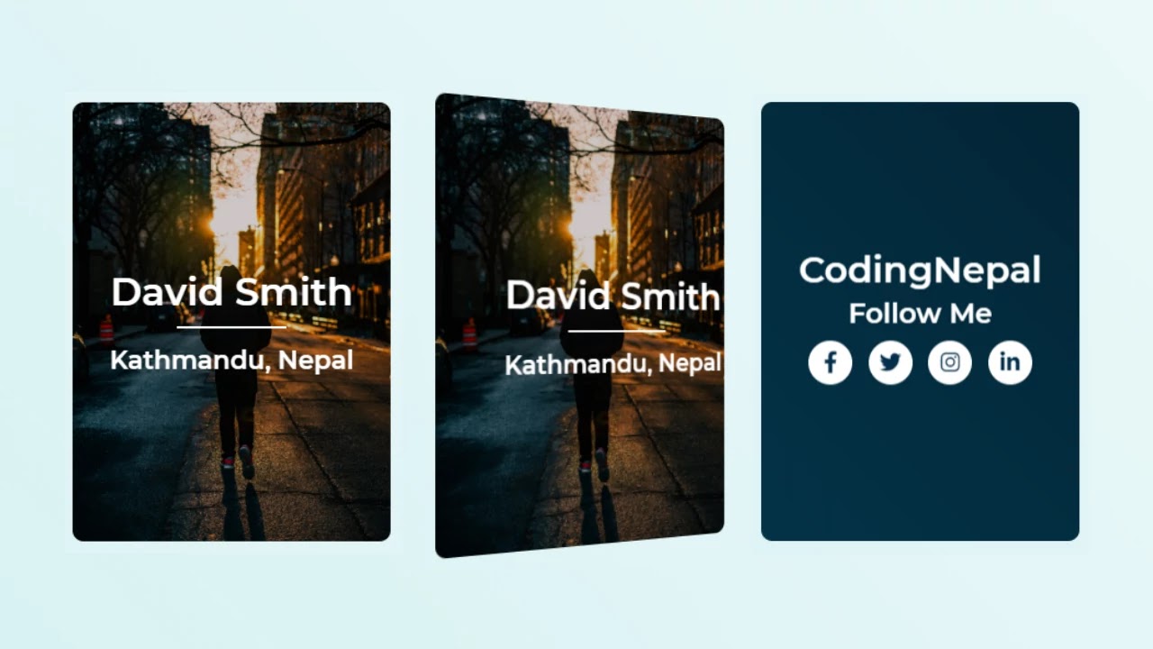 <!DOCTYPE html> <!-- Created By CodingNepal --> <html lang="en" dir="ltr"> <head> <meta charset="utf-8"> <title>3D Flip Card</title> <link rel="stylesheet" href="style.css"> <link rel="stylesheet" href="https://cdnjs.cloudflare.com/ajax/libs/font-awesome/5.15.3/css/all.min.css"/> </head> <body> <div class="center"> <div class="front-face"> <div class="contents front"> <p> David Smith </p> <span>Kathmandu, Nepal</span> </div> </div> <div class="back-face"> <div class="contents back"> <h2> CodingNepal </h2> <span>Follow Me</span> <div class="icons"> <i class="fab fa-facebook-f"></i> <i class="fab fa-twitter"></i> <i class="fab fa-instagram"></i> <i class="fab fa-linkedin-in"></i> </div> </div> </div> </div> </body> </html>